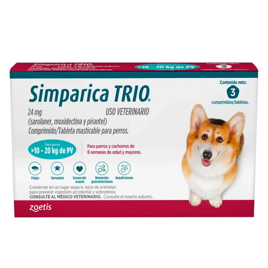 Antipulgas para perros Simparica Trio de 10 a 20 kilos x 3tab